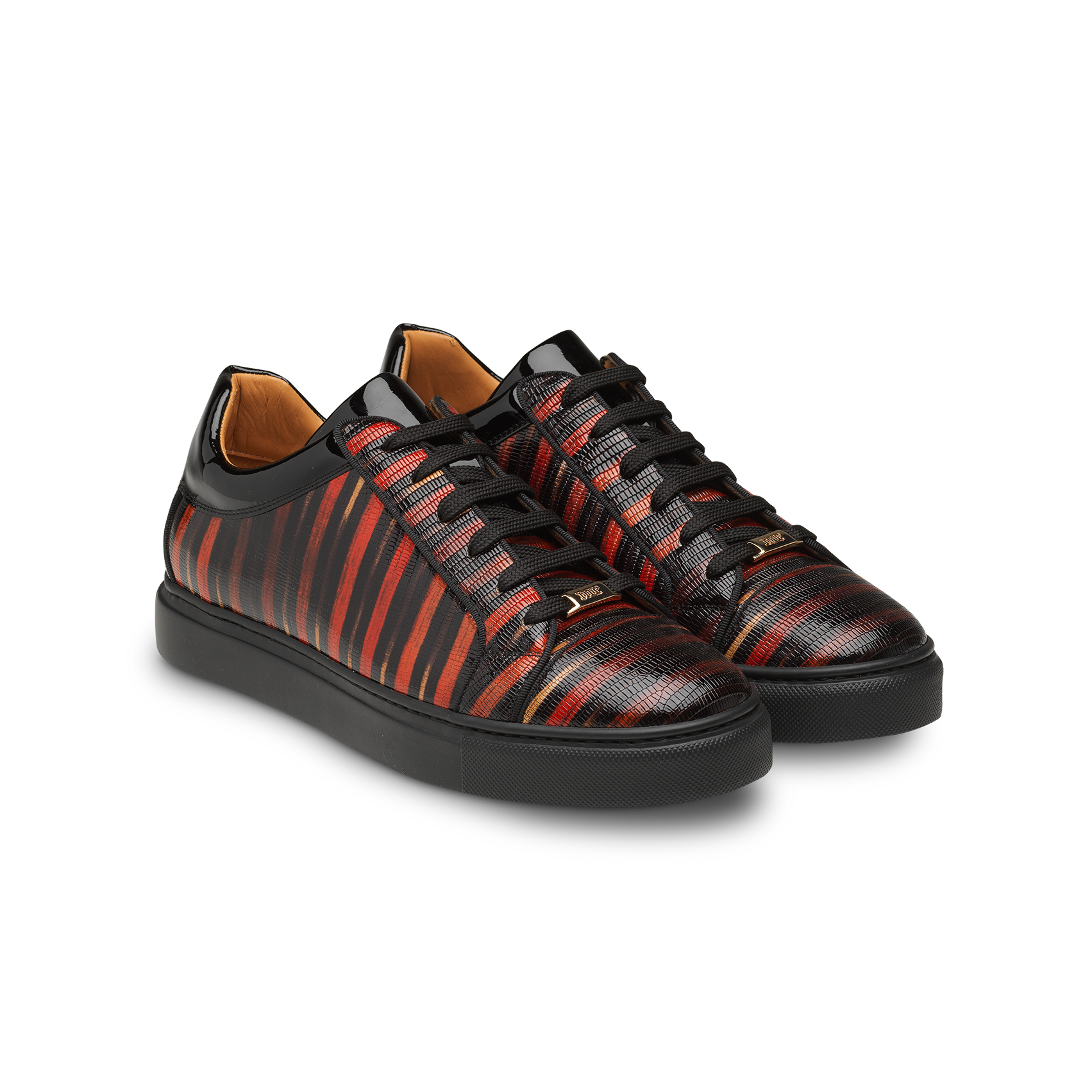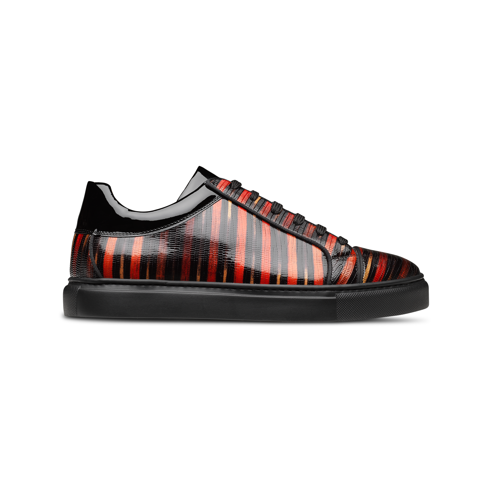 Zapatilla de hombre con cordones, fabricadas en piel de vacuno acabado brillo con grabado de lagarto en tonos rojos.